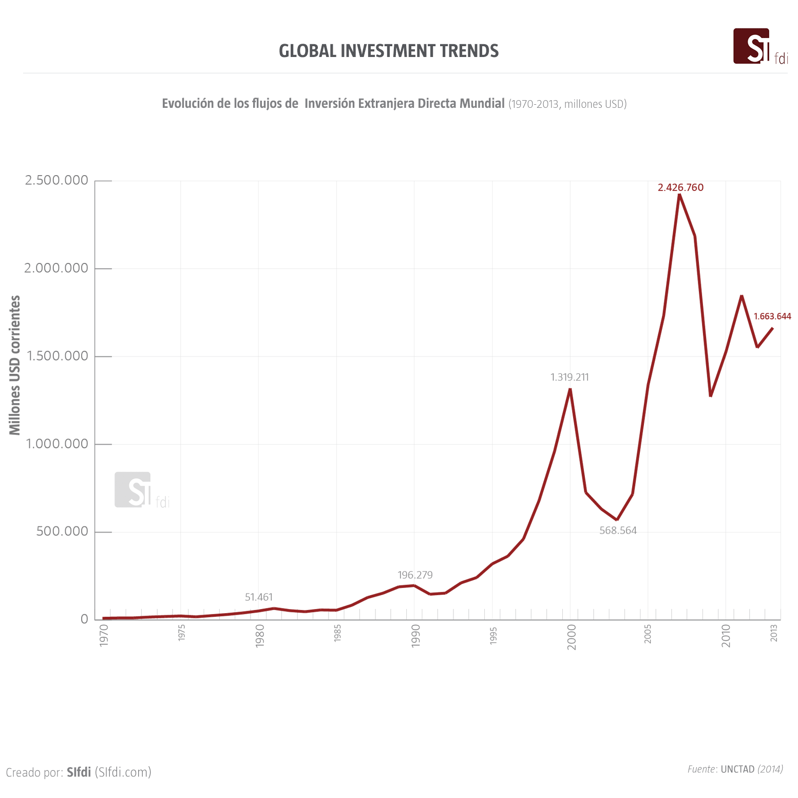 Aunque no están todavía disponibles los datos definitivos de la UNCTAD (United Nations Conference on Trade and Development) de 2014, en la primera gráfica se puede ver la evolución que éstos han seguido desde 1970. Como se observa en ella, y a pesar del frenazo en la progresión experimentado durante estos últimos años de crisis global, la IED a nivel mundial ha experimentado un crecimiento exponencial, en especial a partir de los años 90. Este crecimiento se ha visto truncado en dos claras crisis, la primera de ellas tras el estallido de la burbuja de las empresas punto com en los años 2000, que paró en seco las inversiones internacionales en infraestructuras y en nuevas tecnologías, y la segunda tras el comienzo de la última crisis en 2007, aunque en muchos países como España los efectos en la IED se notaron a partir de 2008. A pesar de la vuelta al crecimiento de los últimos años, los flujos globales todavía siguen un 30% por debajo de los niveles marcados en 2007.