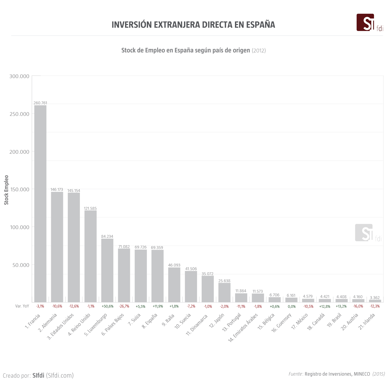 Como puede observarse en las gráficas de stock no siempre hay una relación directa entre niveles de inversión y empleo, ya que esta segunda variable es muy dependiente de la tipología de la inversión. Los países europeos copan los primeros puestos en cuanto a empleo, con la única excepción de Estados Unidos. La primera economía asiática en cuanto a stock de empleo es Japón, en el duodécimo lugar, con casi la mitad del empleo generado por empresas del continente asiático. En un año de moderados descensos en la mayoría de países, destaca el crecimiento por encima del 50% de Luxemburgo (ese año fue el tercer país en flujos de inversión bruta hacia España, con niveles de inversión inferiores a los de este último año).