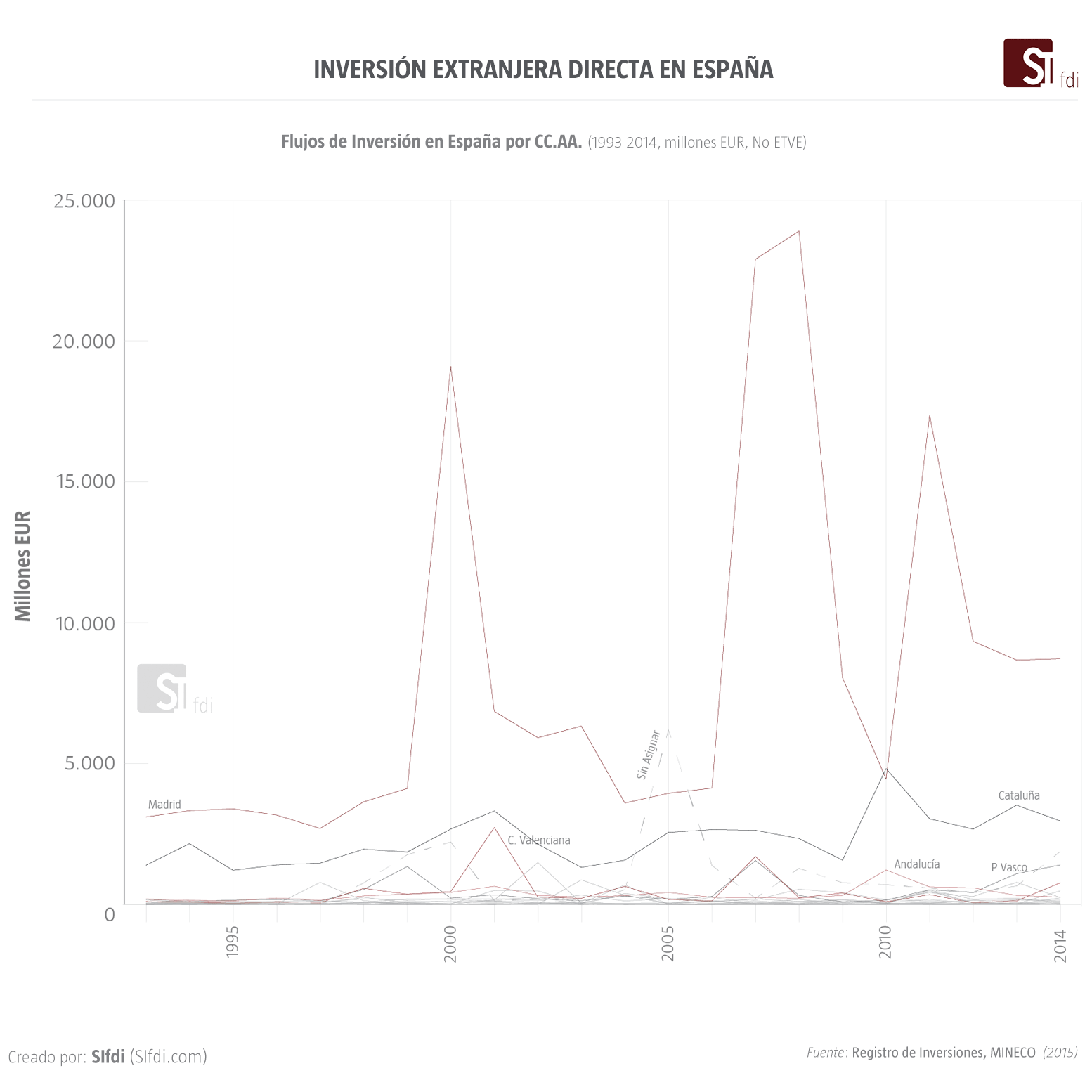 Si se normalizan los datos de 2014 por la población de cada Comunidad Autónoma y se analiza la inversión per cápita, la Comunidad de Madrid (1.343€) sigue siendo la principal región, pero esta vez seguida del País Vasco (642€) y el Principado de Asturias (456€). Cataluña (393€) se colocaría como la cuarta región, con una inversión per cápita levemente por encima de la media nacional (374€). Otras regiones que mejorarían su posición frente al análisis de flujos totales incluyen a las Islas Baleares (227€) o Extremadura (217€), mientras que la Comunidad Valenciana (158€) o Andalucía (32€) pierden tres y siete posiciones, respectivamente.