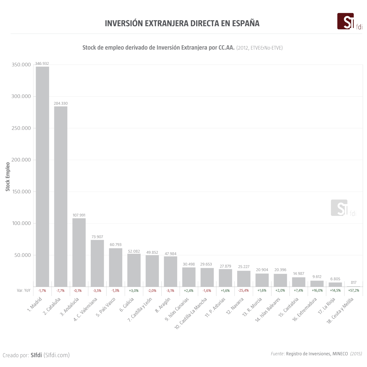 Atendiendo al destino regional de la inversión en España, Madrid tradicionalmente ha sido la principal receptora de inversión extranjera productiva, con la excepción del año 2010. Existe pues un fuerte efecto sede, del que se benefician tanto la Comunidad de Madrid como Cataluña, tanto por la forma de asignar la inversión en aquellos casos en los que el inversor no indique dónde ésta será efectiva como por el poder de atracción de las grandes inversiones que ejercen las propias sedes de las grandes empresas españolas (así como por las operaciones de adquisiciones de empresas ya ubicadas en ellas). Aunque en cuanto a recepción de flujos la diferencia entre ambas regiones es notable algunos años, la distancia se reduce mucho en cuanto al stock de empleo derivado, siendo Cataluña probablemente el líder en cuanto a inversiones en nuevas plantas y bienes de equipo. Otras regiones como el País Vasco, Andalucía o la Comunidad Valenciana se suelen alternar en los siguientes puestos, normalmente dependiendo de lo activas que hayan sido invirtiendo en sus comunidades las grandes multinacionales ya presentes en ellas.